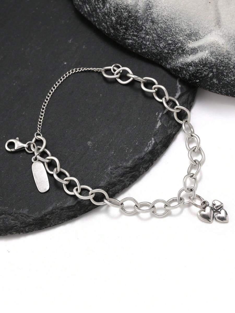 1 pezzo braccialetto semplice, unico ed elegante in argento sterling 925 decorato con ciondolo a forma di cuori raccolti, stile pendente a catena forgiata, regalo di gioielleria fine per le donne
