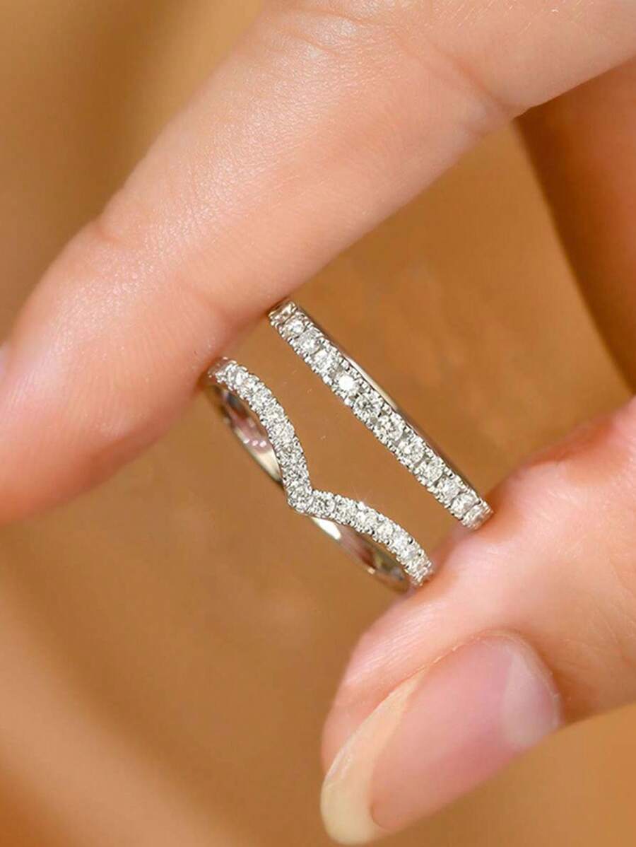 2 pezzi anelli di coppia in platino color con una fila di strass a forma di v e moissanite simulati, anelli semplici a forma di v aperti per uso quotidiano, regalo di san valentino